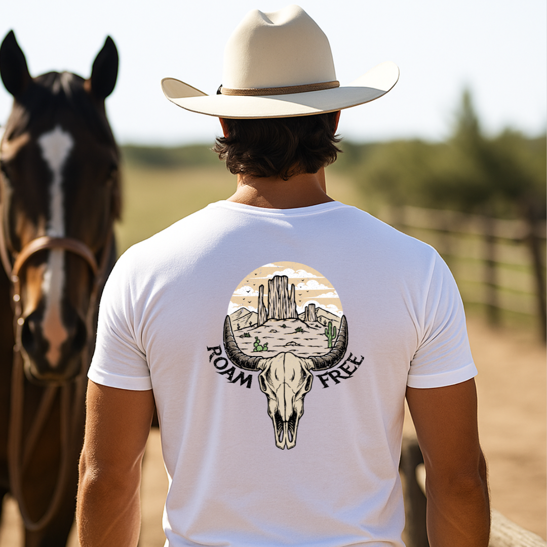 Camiseta casual de corte holgado con cuello redondo, manga corta, 100% Algodón, con diseño vaquero Roam free. Perfecta para el estilo diario.