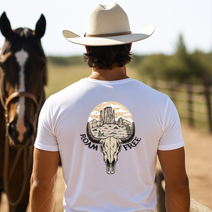 Camiseta casual de corte holgado con cuello redondo, manga corta, 100% algodón, con estampado DTF con diseño vaquero roam free. Perfecta para el estilo diario.