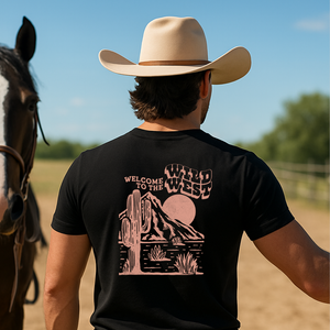 Camiseta casual de corte holgado con cuello redondo, manga corta, 100% Algodón, con diseño vaquero wild west cowboy. Perfecta para el estilo diario.