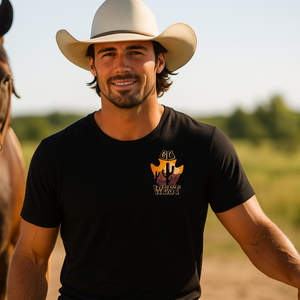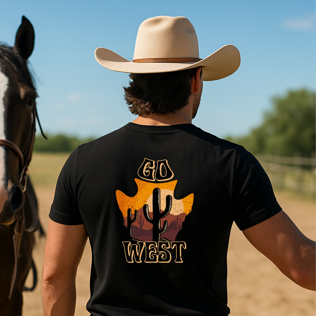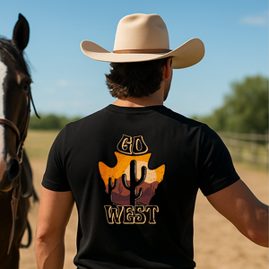 Camiseta casual de corte holgado con cuello redondo, manga corta, 100% Algodón, con diseño vaquero Go west. Perfecta para el estilo diario.