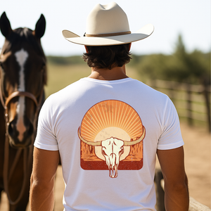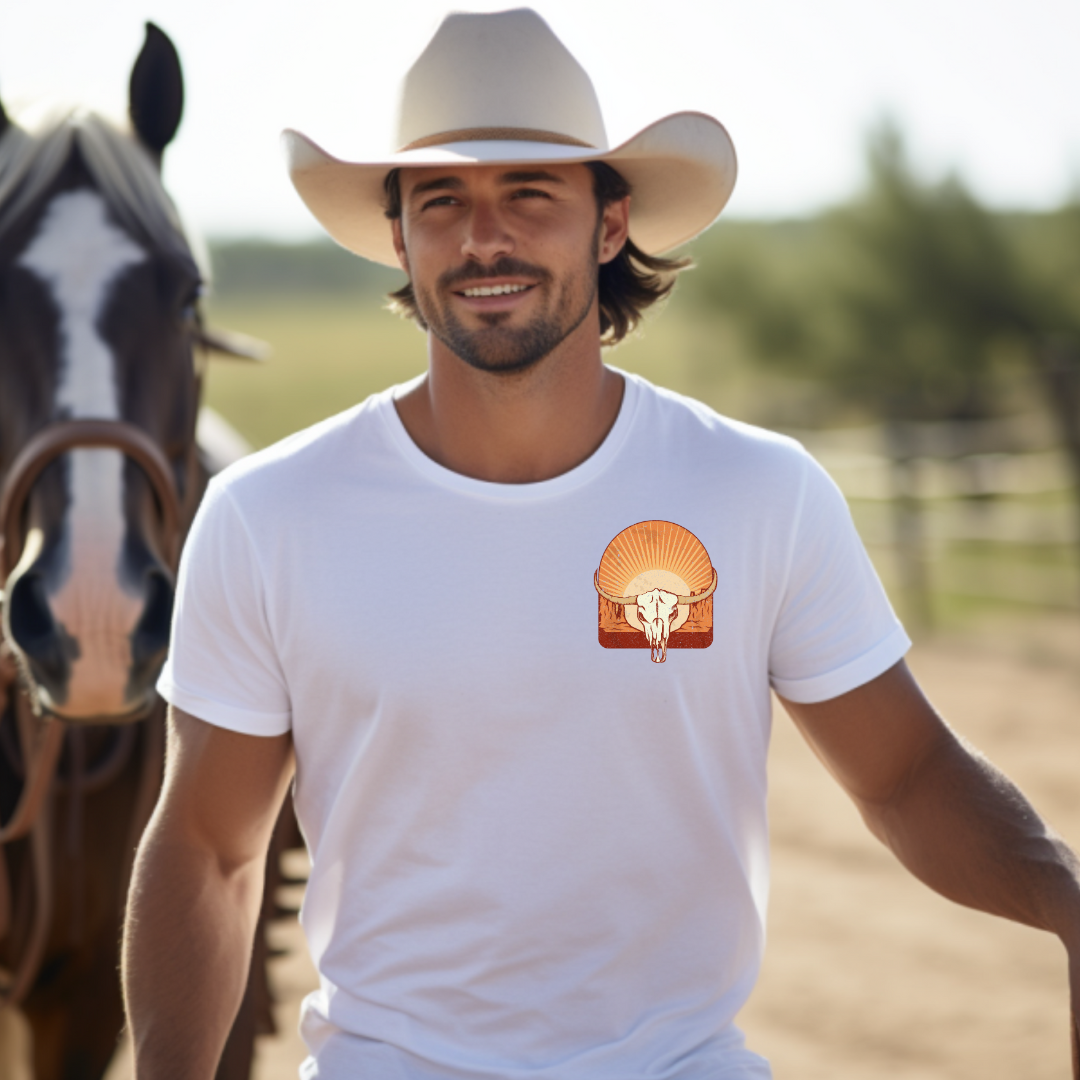 Camiseta casual de corte holgado con cuello redondo, manga corta, 100% algodón, con estampado DTF con diseño vaquero craneo sol. Perfecta para el estilo diario.