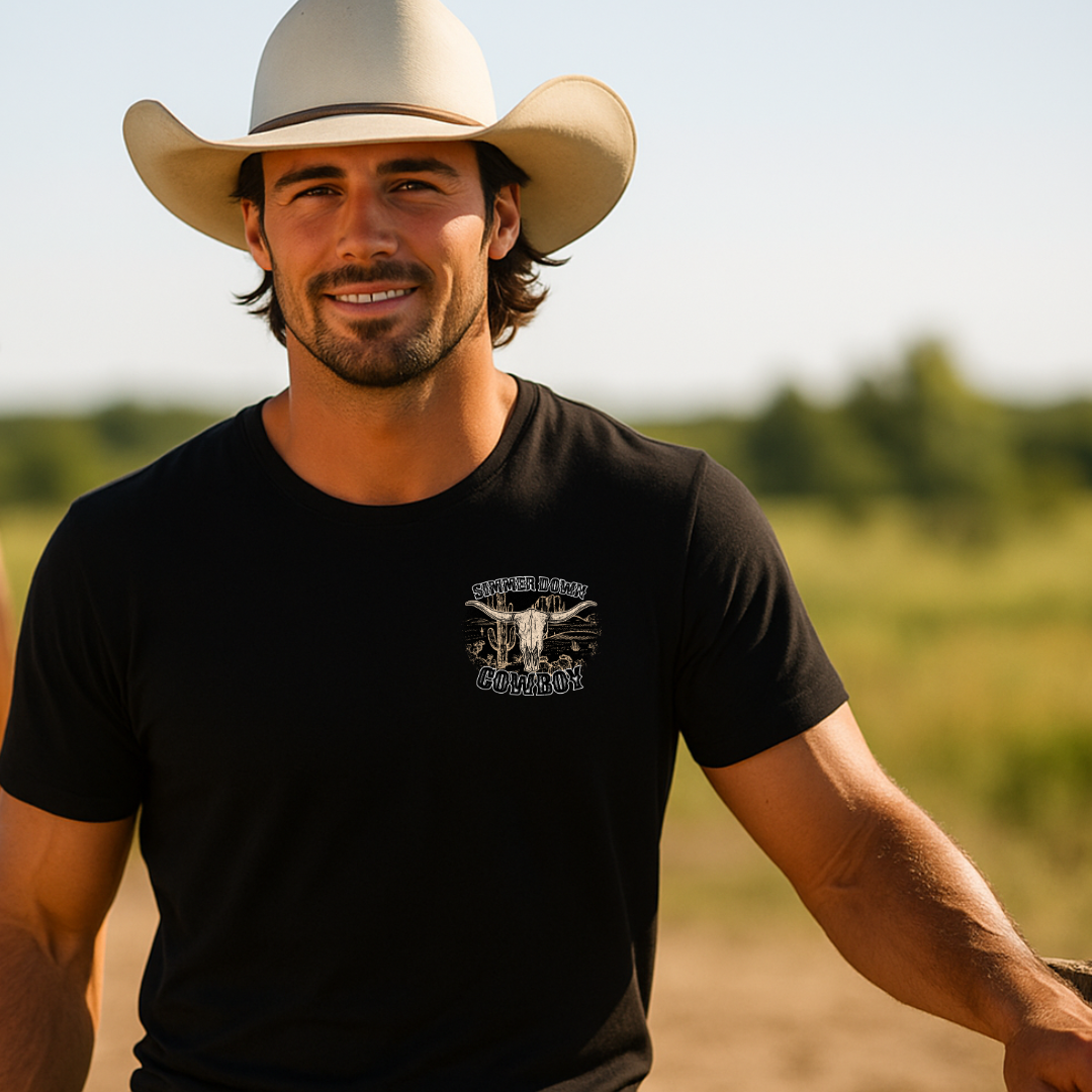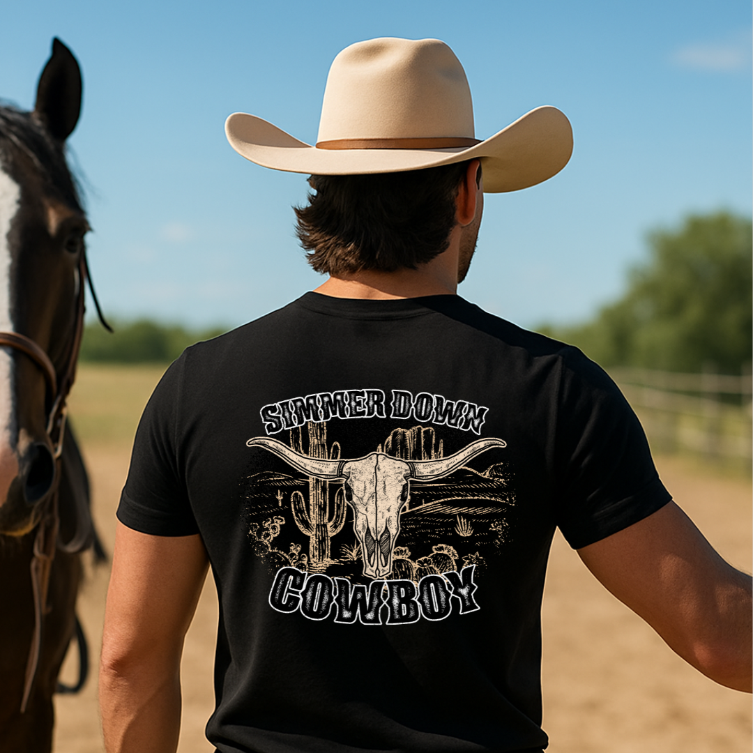 Camiseta casual de corte holgado con cuello redondo, manga corta, 100% Algodón, con diseño vaquero Simmer down Cowboy. Perfecta para el estilo diario.